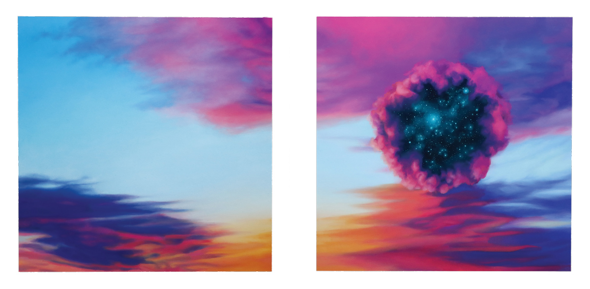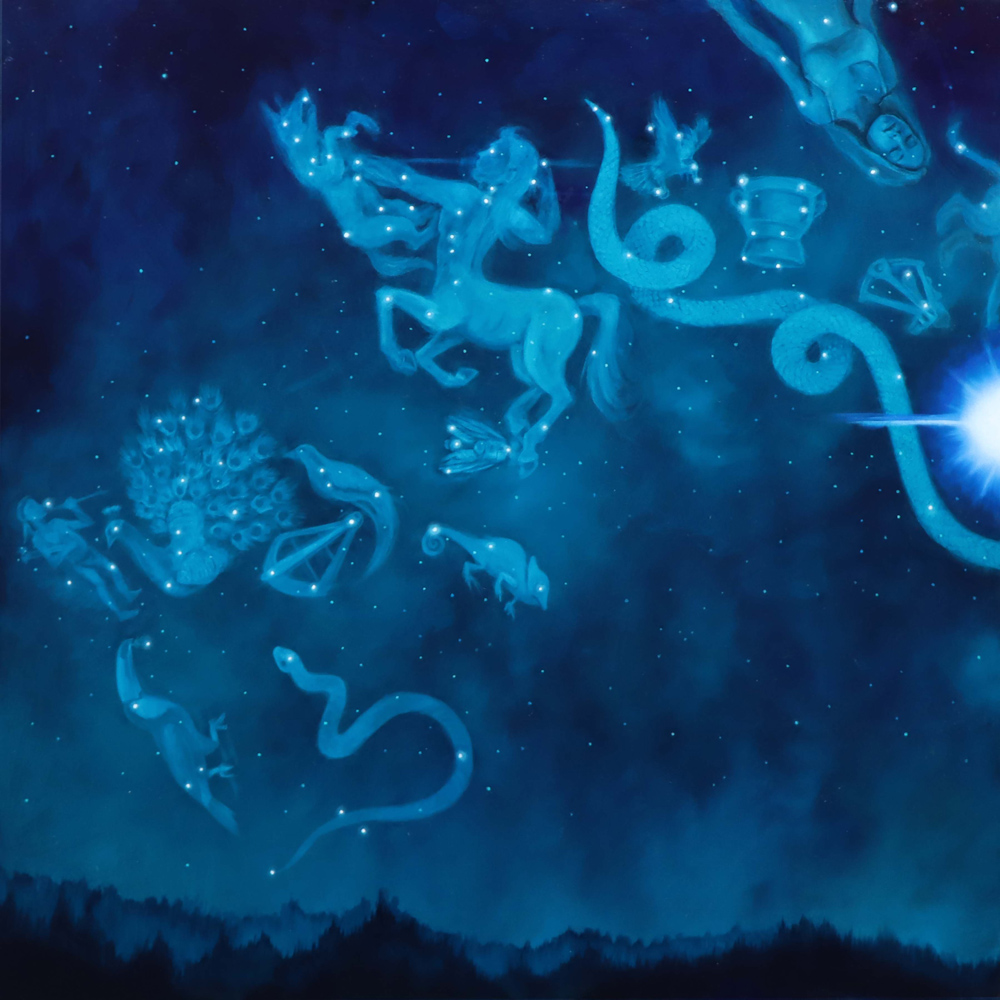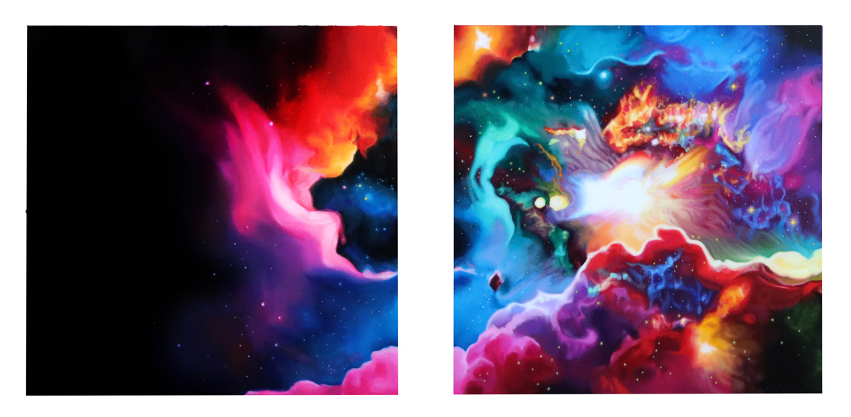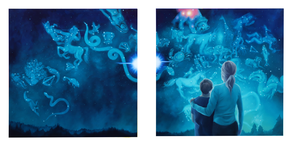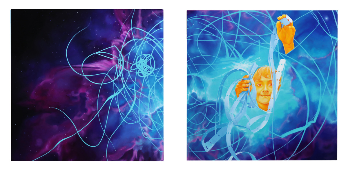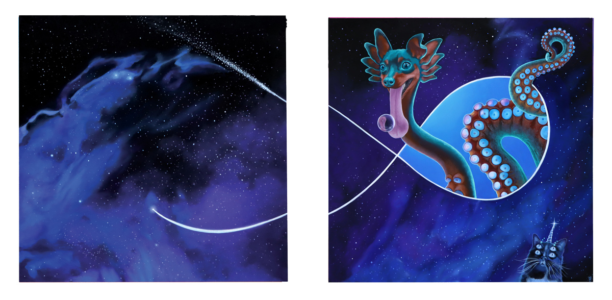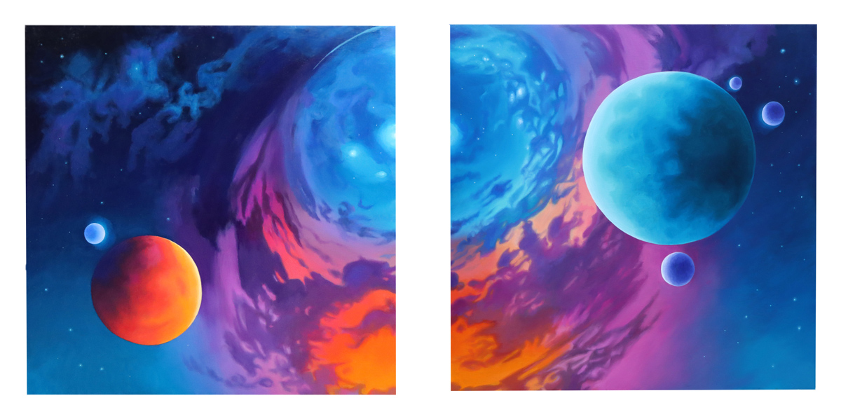 As a cycle breaker, the goal has been to provide a peaceful and nurturing environment especially finding myself playing the role of a single parent, where challenges and their stresses are exponentially higher. Regardless, it is important to maintain a sense of stability and control along with empathy for optimal development. Bedtime has always been a sacred time for us to relax and settle in nightly routines, which has always included a bedtime story. This particular time can be used to literally sit and talk with your child in ways where we use stories to help explain more complex situations. This story personifies celestial bodies, where the parents exist as two separate worlds, presented with their challenges but taking these difficult times and turning them into things that can benefit us, in return, providing more confidence for the future, allowing the mind to rest. Each painting takes up the space of each page allowing for a more immersive experience. The composition for each piece is square as a symbol representing the grid, consistency and unity but also the idea of separation with each spread. Co parenting, personally, has been one of the most challenging situations but through my own growth this story has been created to inspire positivity during times when more families find peace in separation with the challenge of helping children cope. This same concept can be applied to all of us, when we exist in a divided society with the helpful reminder that we are all still united.