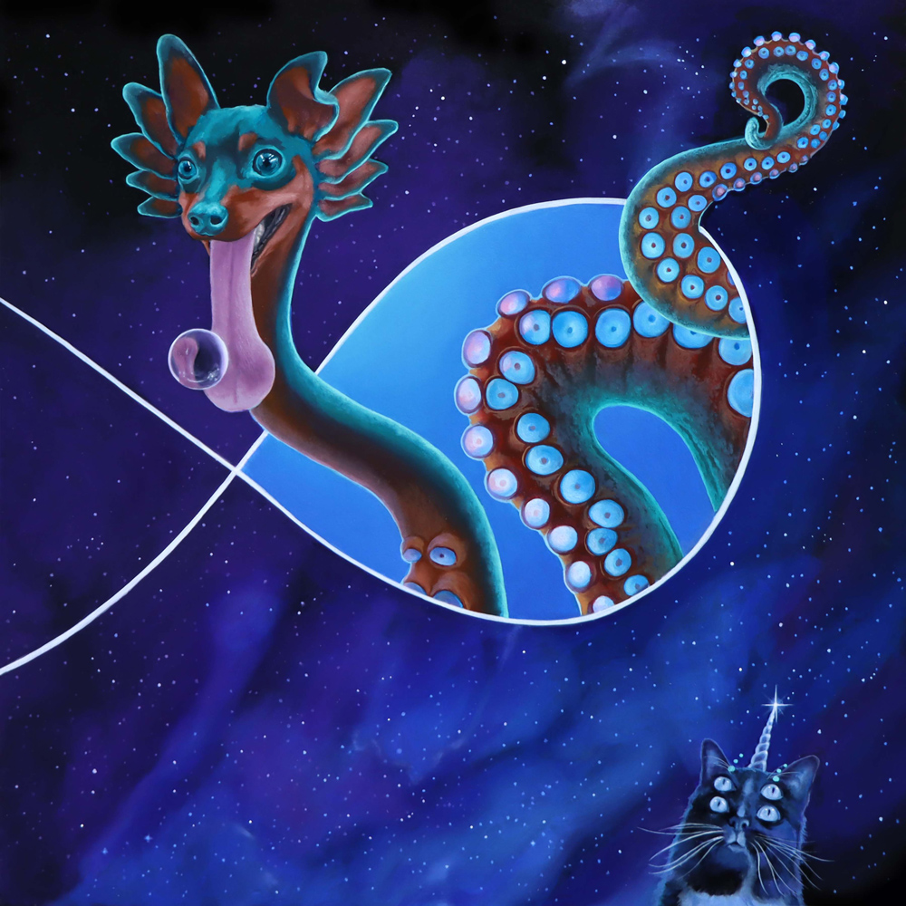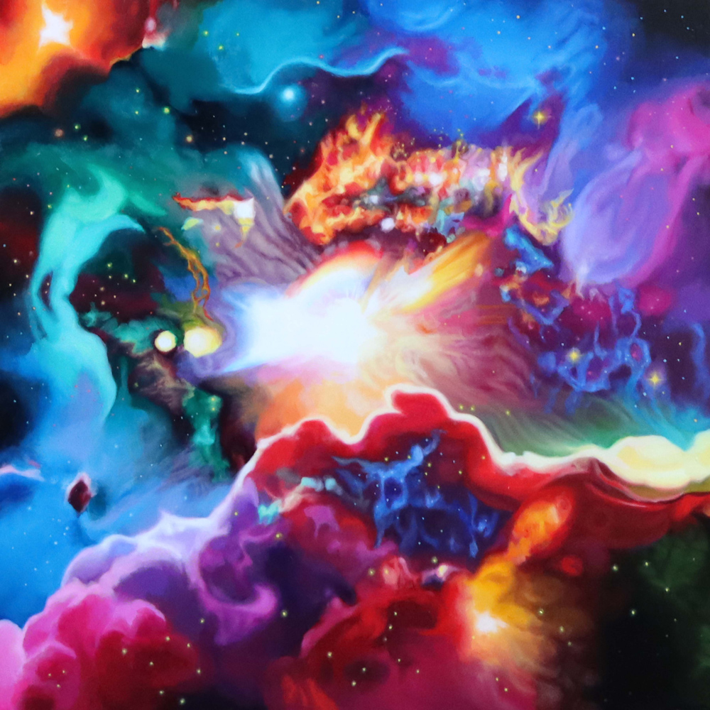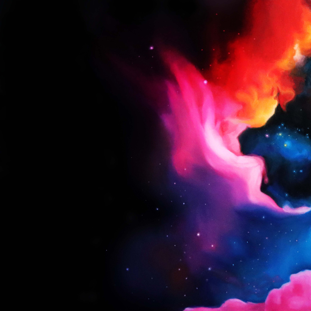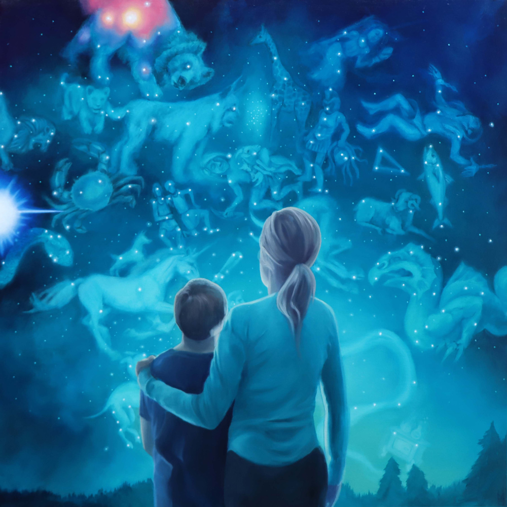 As a cycle breaker, the goal has been to provide a peaceful and nurturing environment especially finding myself playing the role of a single parent, where challenges and their stresses are exponentially higher. Regardless, it is important to maintain a sense of stability and control along with empathy for optimal development. Bedtime has always been a sacred time for us to relax and settle in nightly routines, which has always included a bedtime story. This particular time can be used to literally sit and talk with your child in ways where we use stories to help explain more complex situations. This story personifies celestial bodies, where the parents exist as two separate worlds, presented with their challenges but taking these difficult times and turning them into things that can benefit us, in return, providing more confidence for the future, allowing the mind to rest. Each painting takes up the space of each page allowing for a more immersive experience. The composition for each piece is square as a symbol representing the grid, consistency and unity but also the idea of separation with each spread. Co parenting, personally, has been one of the most challenging situations but through my own growth this story has been created to inspire positivity during times when more families find peace in separation with the challenge of helping children cope. This same concept can be applied to all of us, when we exist in a divided society with the helpful reminder that we are all still united.